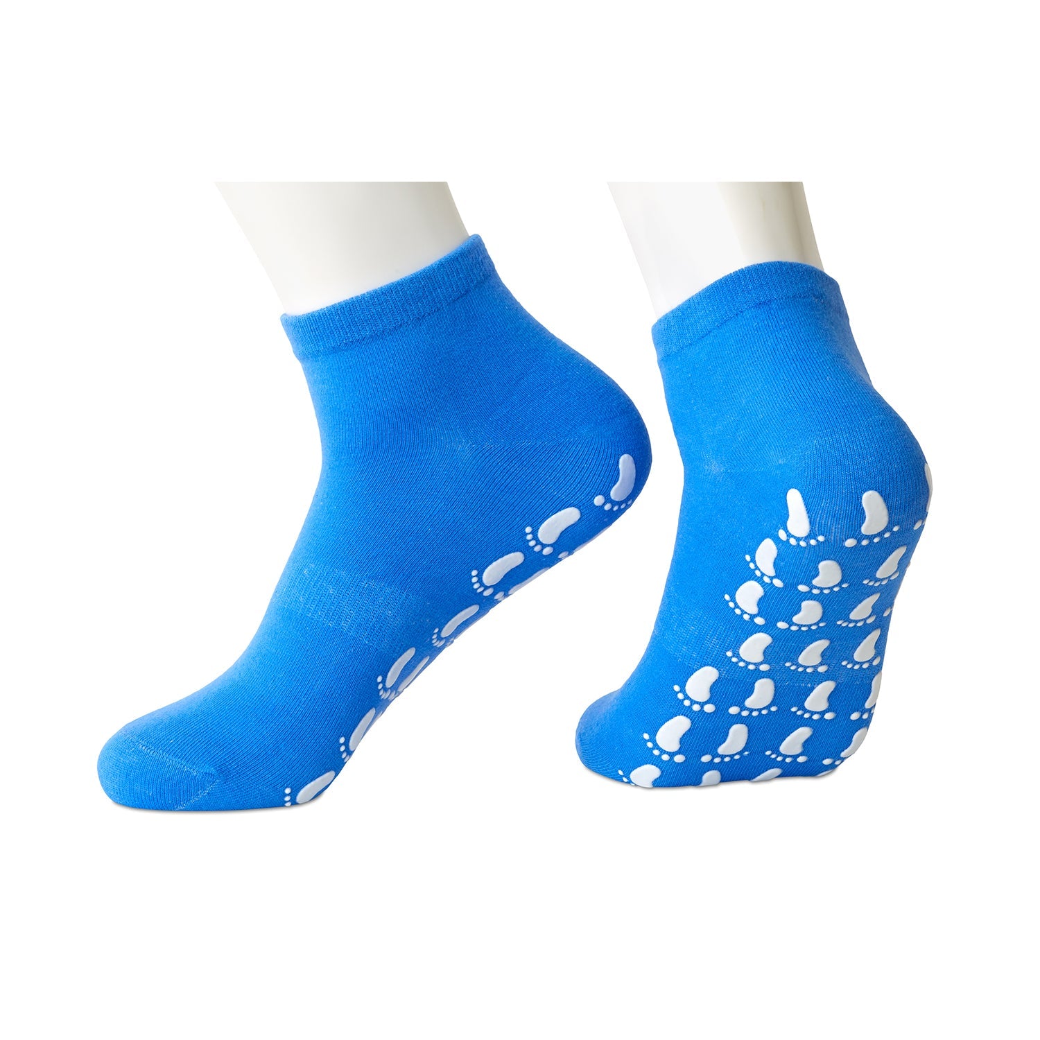 These happy (and practical) sky blue ankle socks sport white foot-shaped grippers for a bit of extra security on slippery floor surfaces.