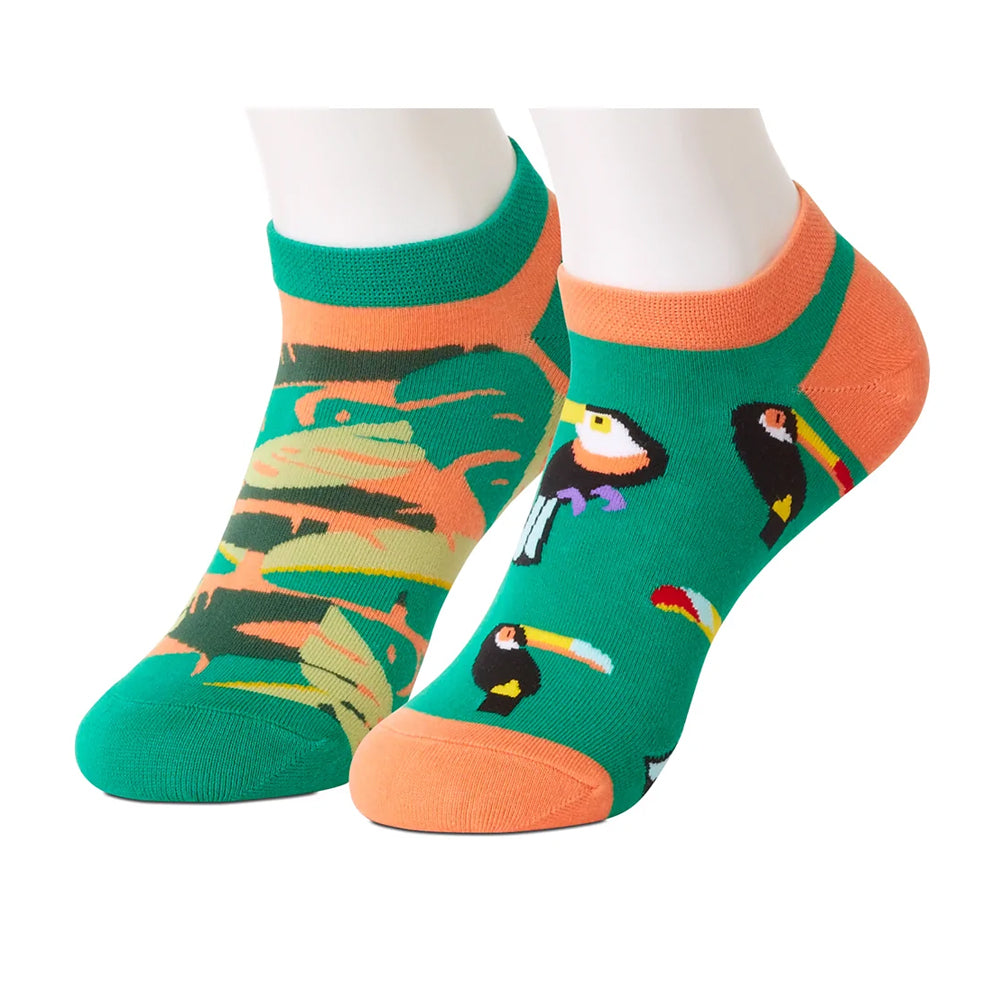Have some fun with these mismatched ankle socks - one featuring colorful toucans and one with their jungle habitat, both in shades of verdant green and peach.