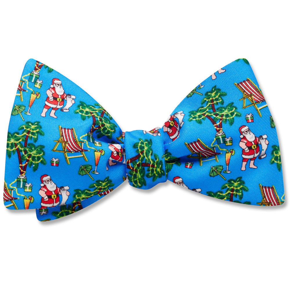 Sometimes, it seems, Santa needs a break from the cold. We found him doing a bit of barefoot research on bright blue silk twill among palm trees and sand. He looks good!