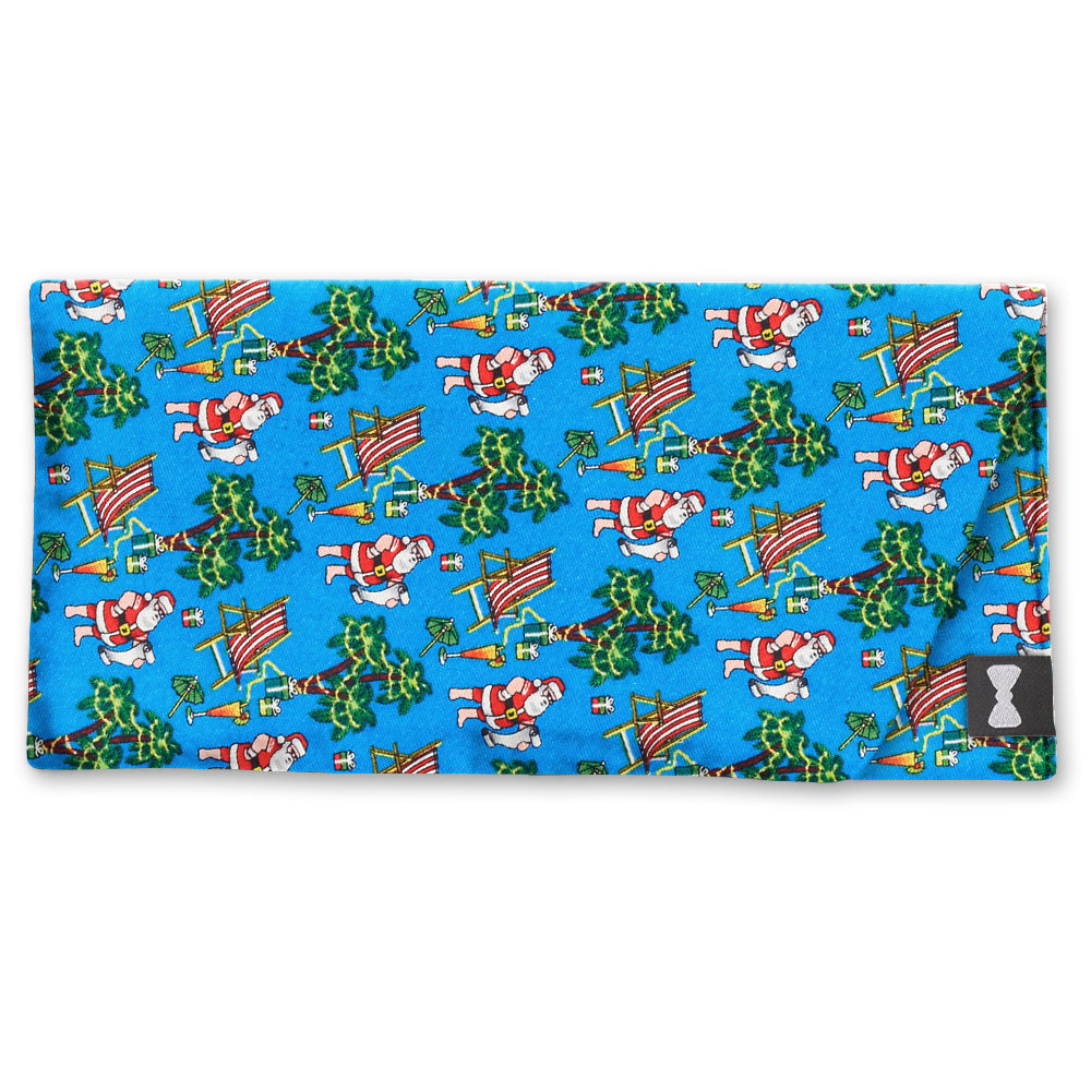 Sometimes, it seems, Santa needs a break from the cold. We found him doing a bit of barefoot research on bright blue silk twill among palm trees and sand. He looks good!