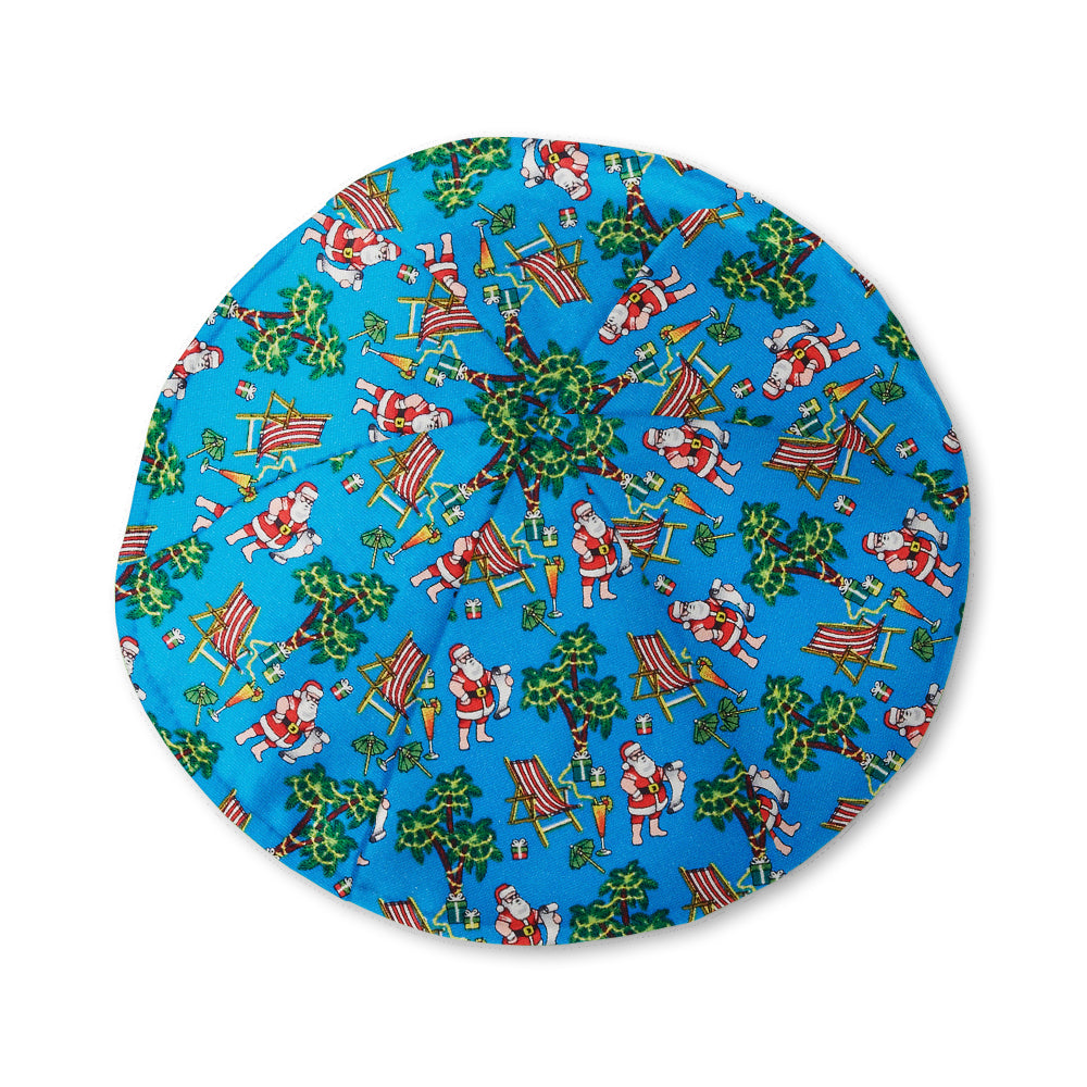 Sometimes, it seems, Santa needs a break from the cold. We found him doing a bit of barefoot research on bright blue silk twill among palm trees and sand. He looks good!