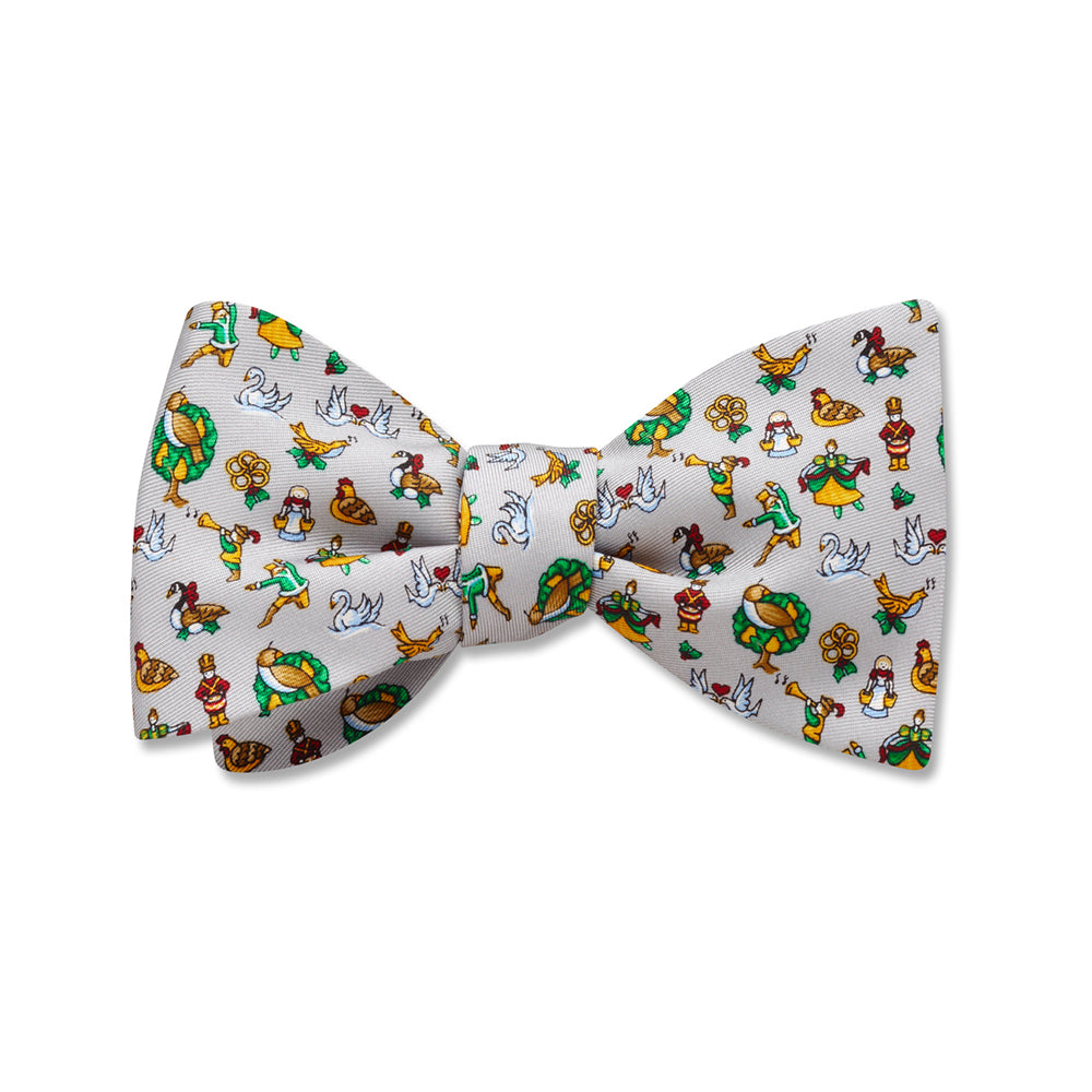 All the gifts that someone's true love lavished upon her (or him?)from the partridge to the drummersare cleverly featured here on silvery grey silk twill. A totally charming choice.