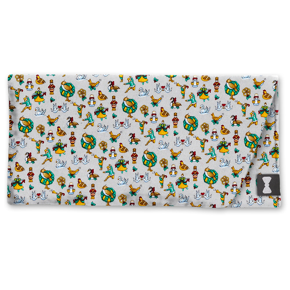 All the gifts that someone's true love lavished upon her (or him?)from the partridge to the drummersare cleverly featured here on silvery grey silk twill. A totally charming choice.