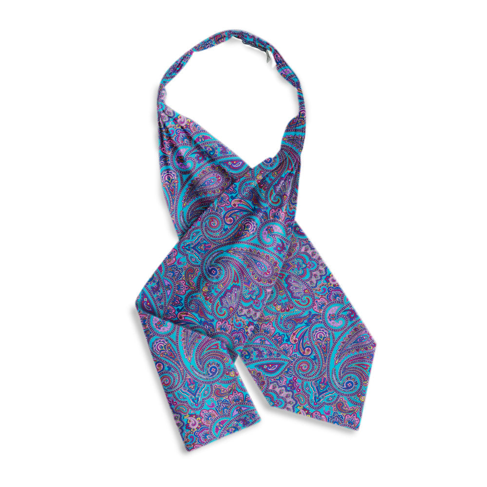 The Turquoise Bay patterned free-fold cravat features three stiched center pleats that allow luxurious drape in front without fabric bulk at the nape of your neck. It is completely reversible and sized for a perfect fit. May require a stick-pin.