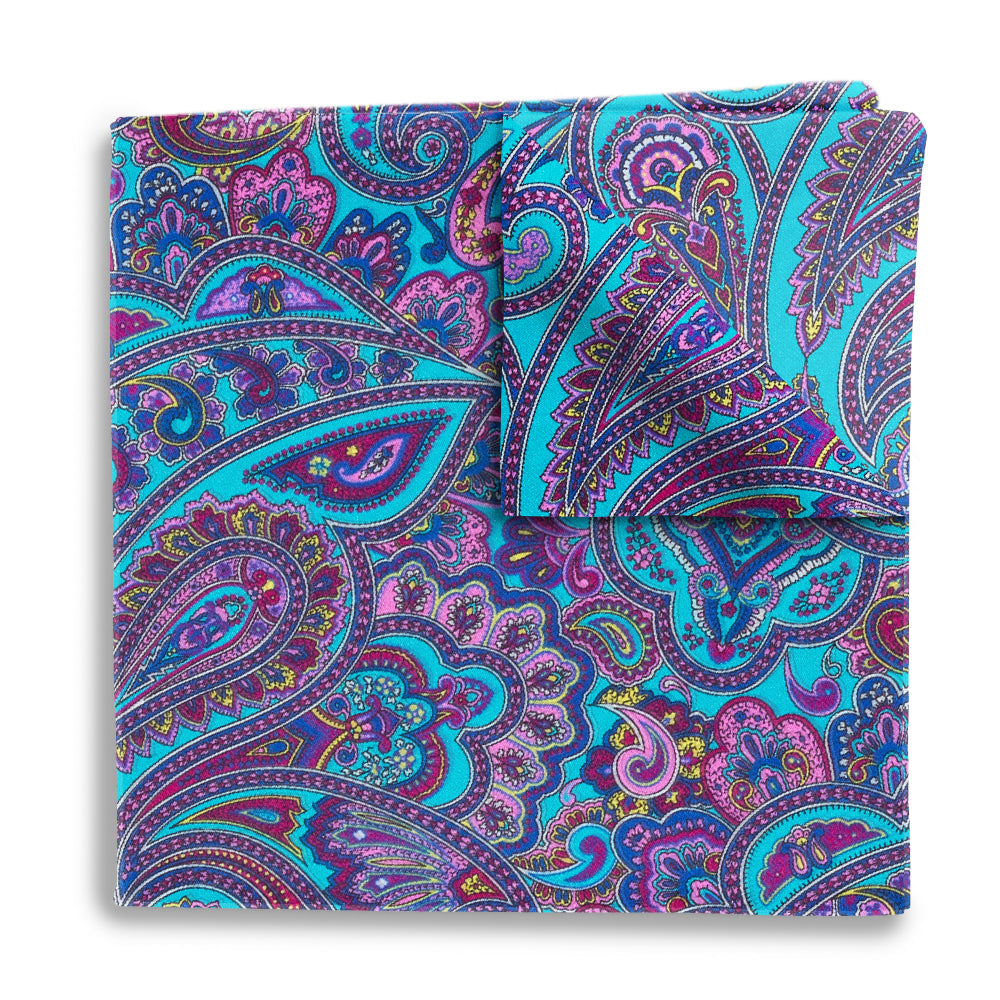 An outstanding Italian silk paisley design in a splendid combination of turquoise, pink, gold, red and blue. Prepare to be noticed!