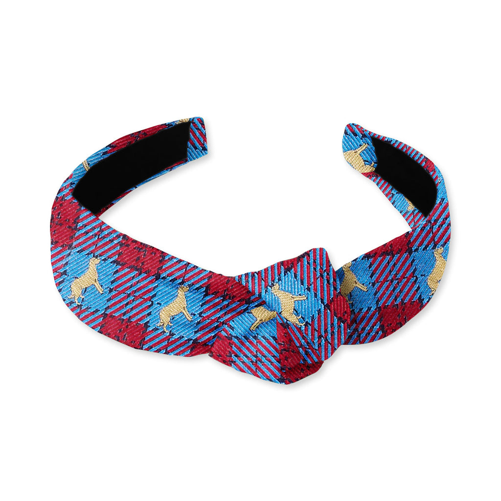 In a nod to the land of their origin, these golden retrievers are woven into a red and blue plaid, and appear to be ready and able to get to work or have some fun - whichever you prefer.