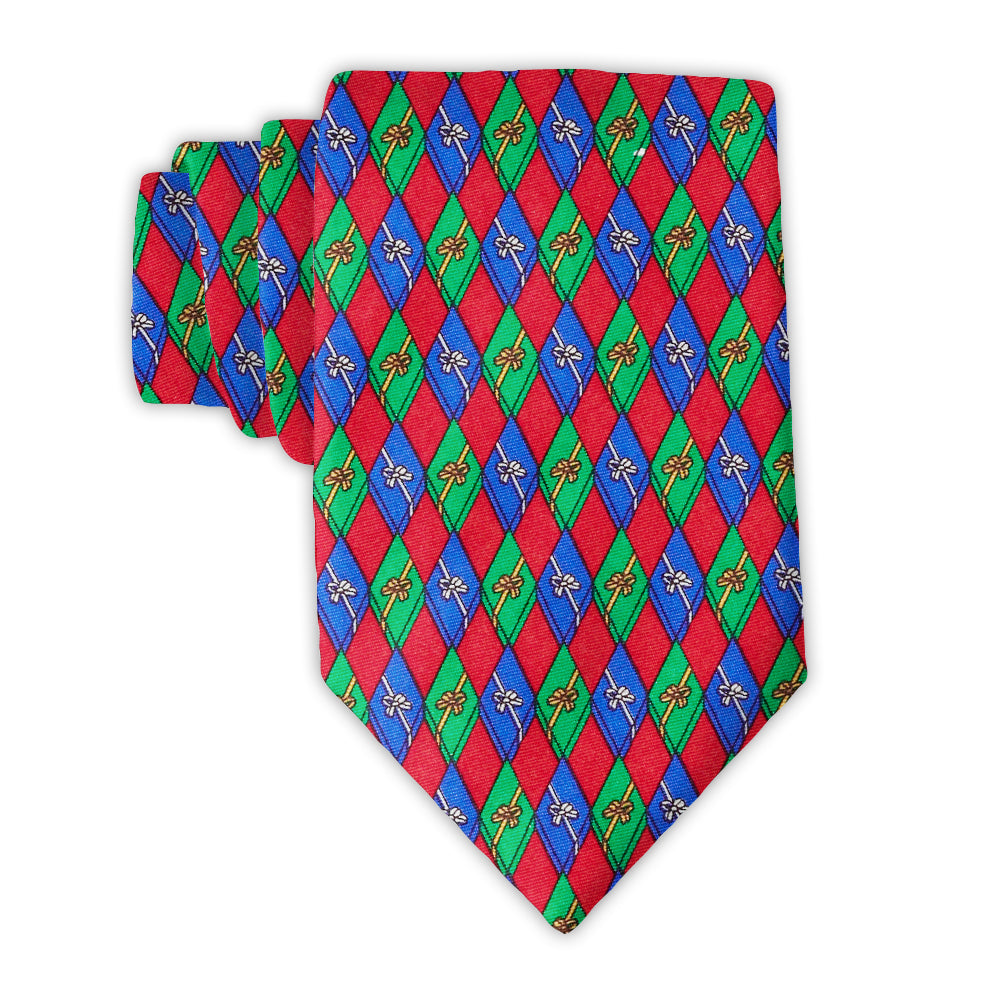 Beribboned boxes of blue and green are tossed on red silk twill in an eye-catching diamond design. It may take a look or two to figure it out. . .