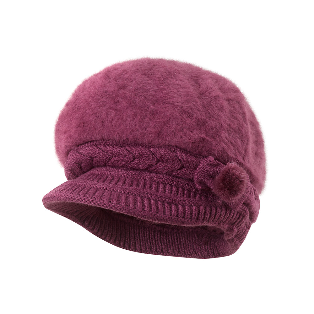 Totally on trend for the winter season to come, this purple visor beanie is warm and fuzzy -and very cool with its pom-pom-centered bow tie just above the neatly knitted brim.