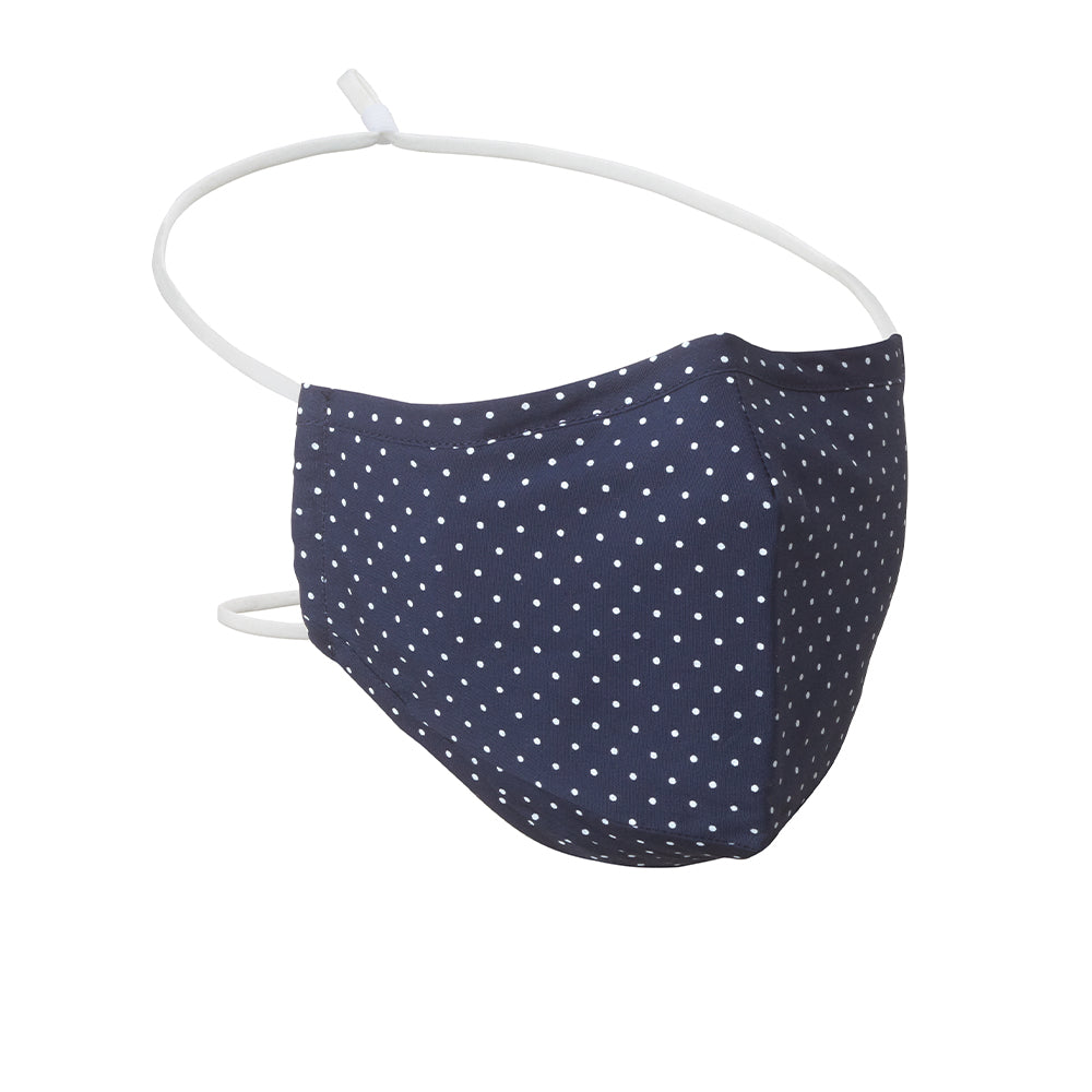 Cover up and look good in this triple-layer, all-cotton face mask featuring a classic white polka dot pattern on navy blue.