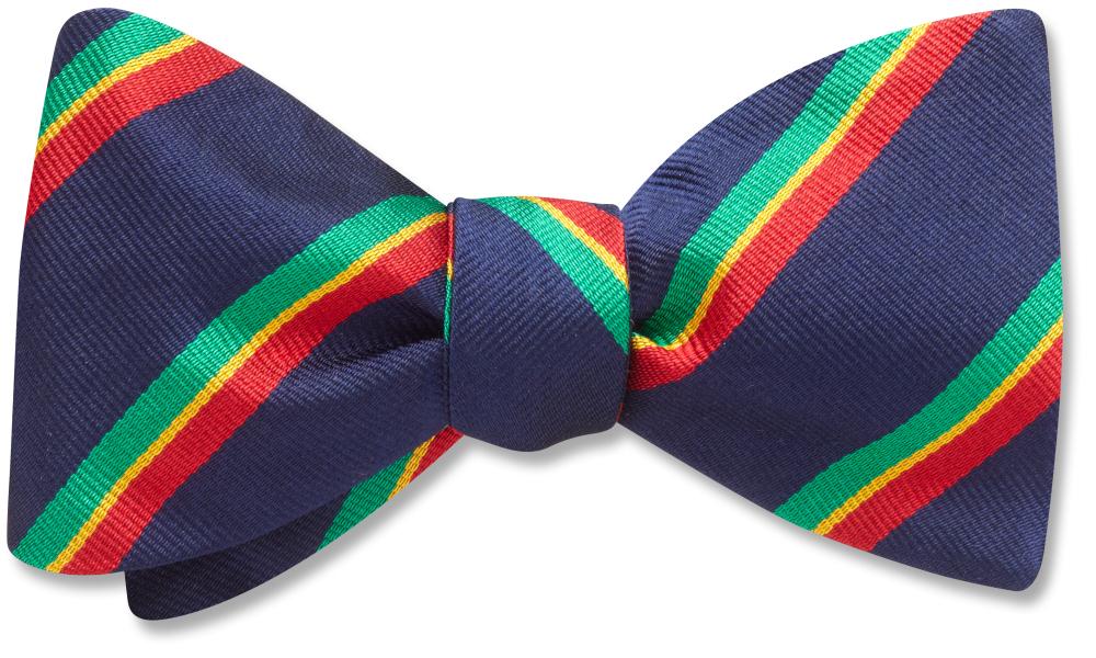 A stunning British woven silk featuring broad bands of navy blue between trios of spruce green, warm gold and wine red. If you've been searching for a great new stripe, you've just found it.