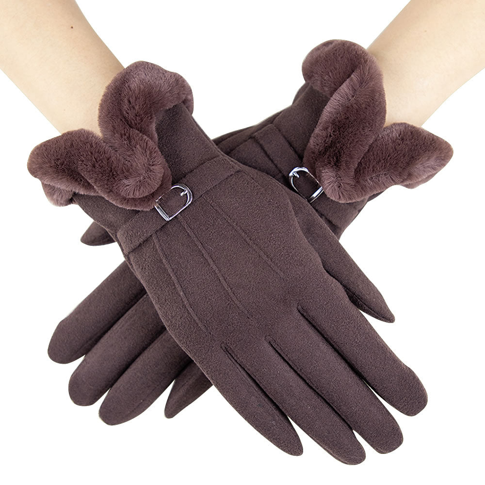 With classic styling, including a strap across the back of the hand and fuzzy fur-like trim around the wrist, these deep brown gloves also feature two-finger touch screen capability - so you'll never need to take them off to swipe a screen or type a text, no matter how cold it is!