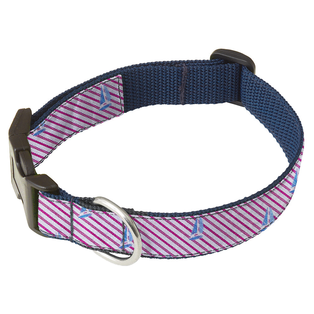 No need to be a sailor to love this raspberry-red and white striped cotton option with its fleet of blue sailboats.
