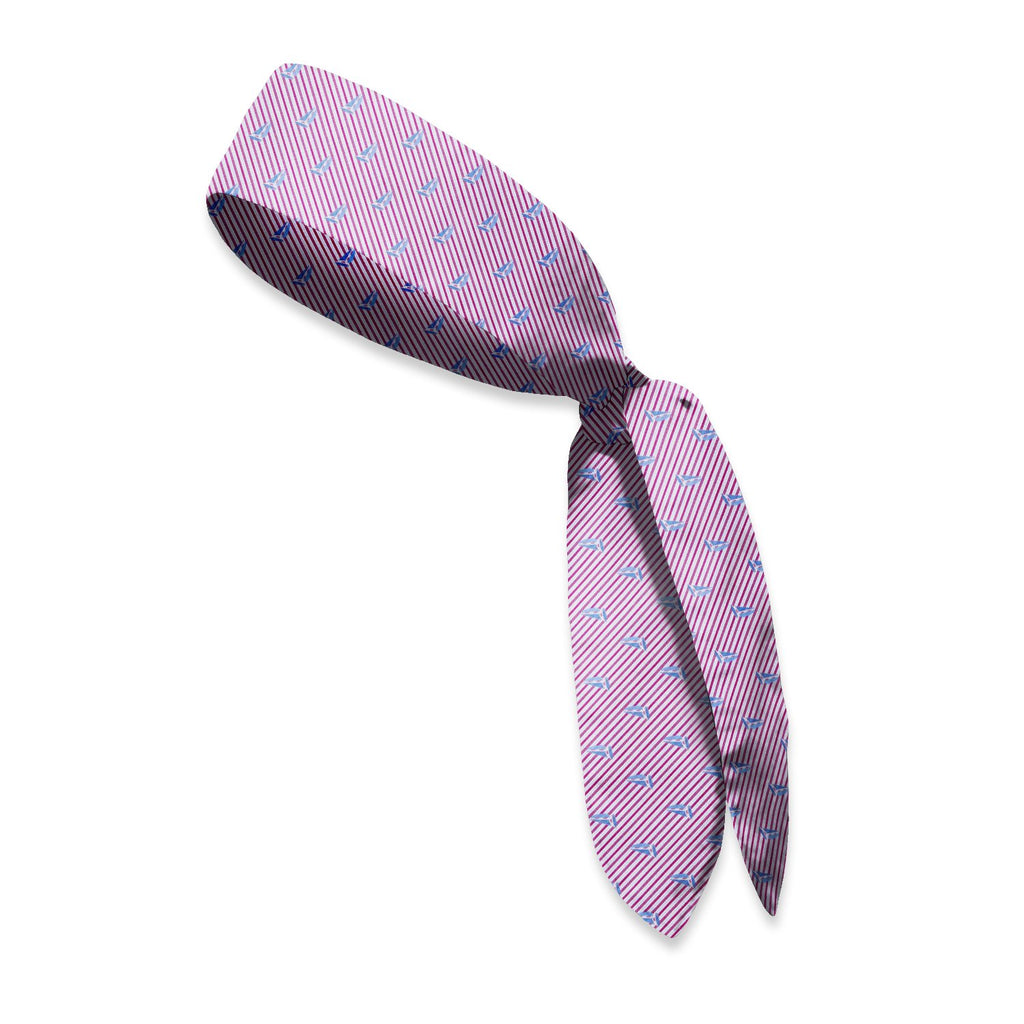 No need to be a sailor to love this raspberry-red and white striped cotton fabric with its fleet of blue sailboats.