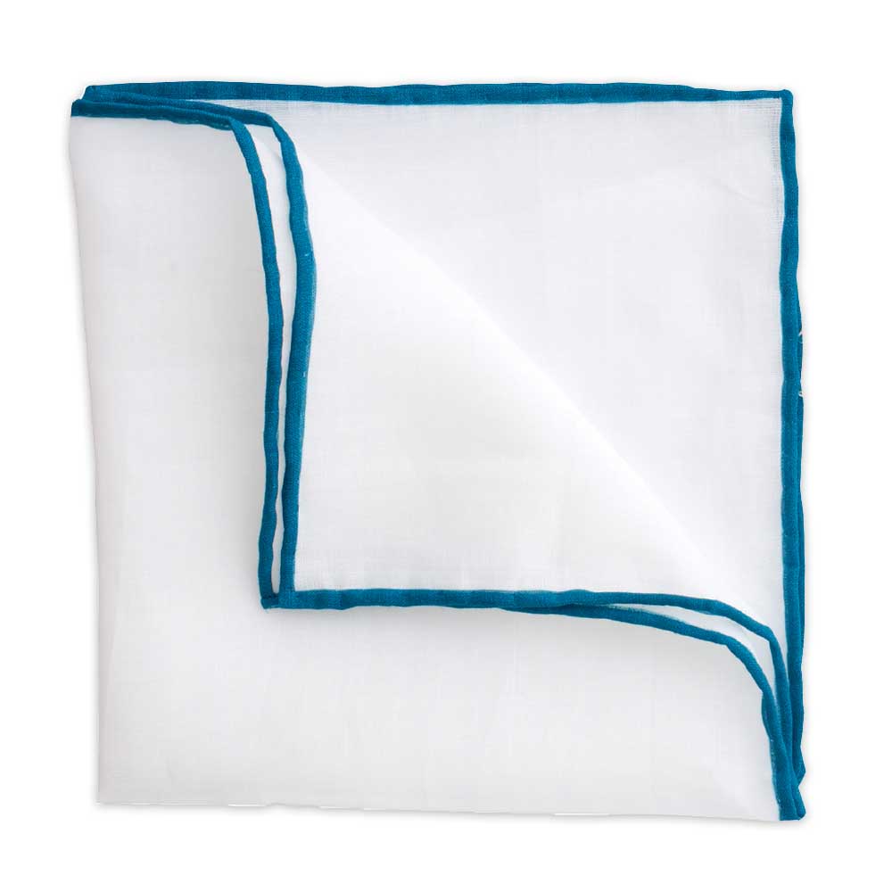 A basic must have for putting an ideal finishing touch on your outfit, this white linen pocket squares with its hand-rolled turquoise hem will serve you well. This pocket square measures a generous 13 x 13.