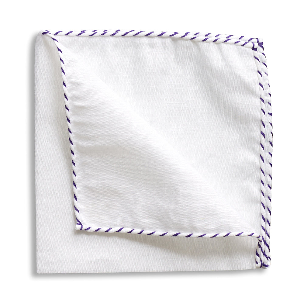 Created with a delicate hand, this white linen blend pocket square's edges are hand-rolled twice - first into a solid thread, and then again with a purple thread. The result is a fresh and oh-so-appealing style.