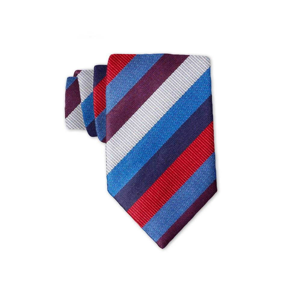 Beautifully woven in grey, silver, black, blue, red and burgundy silk, this stripe with its varying colors and textures is a show-stopper.