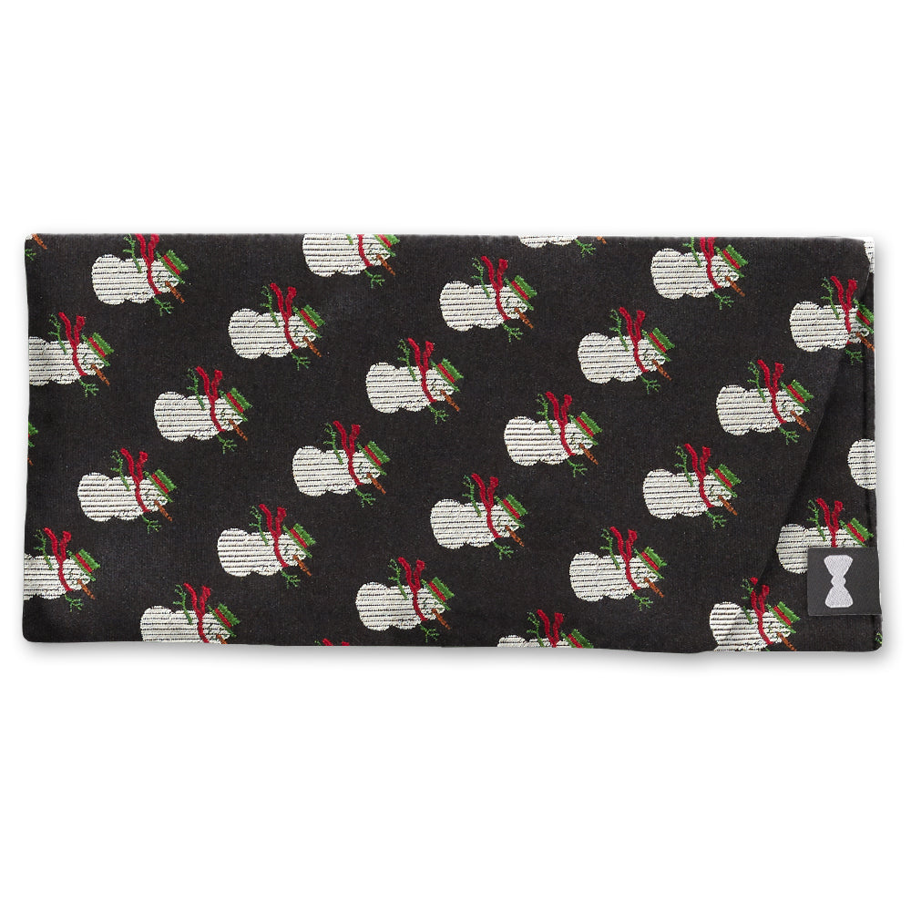 An entire village of happy snowmen - each sporting a red scarf, green arms, a red and green top hat, a carrot nose and sparkling silver buttons - is woven in midnight black silk. A winter winner!