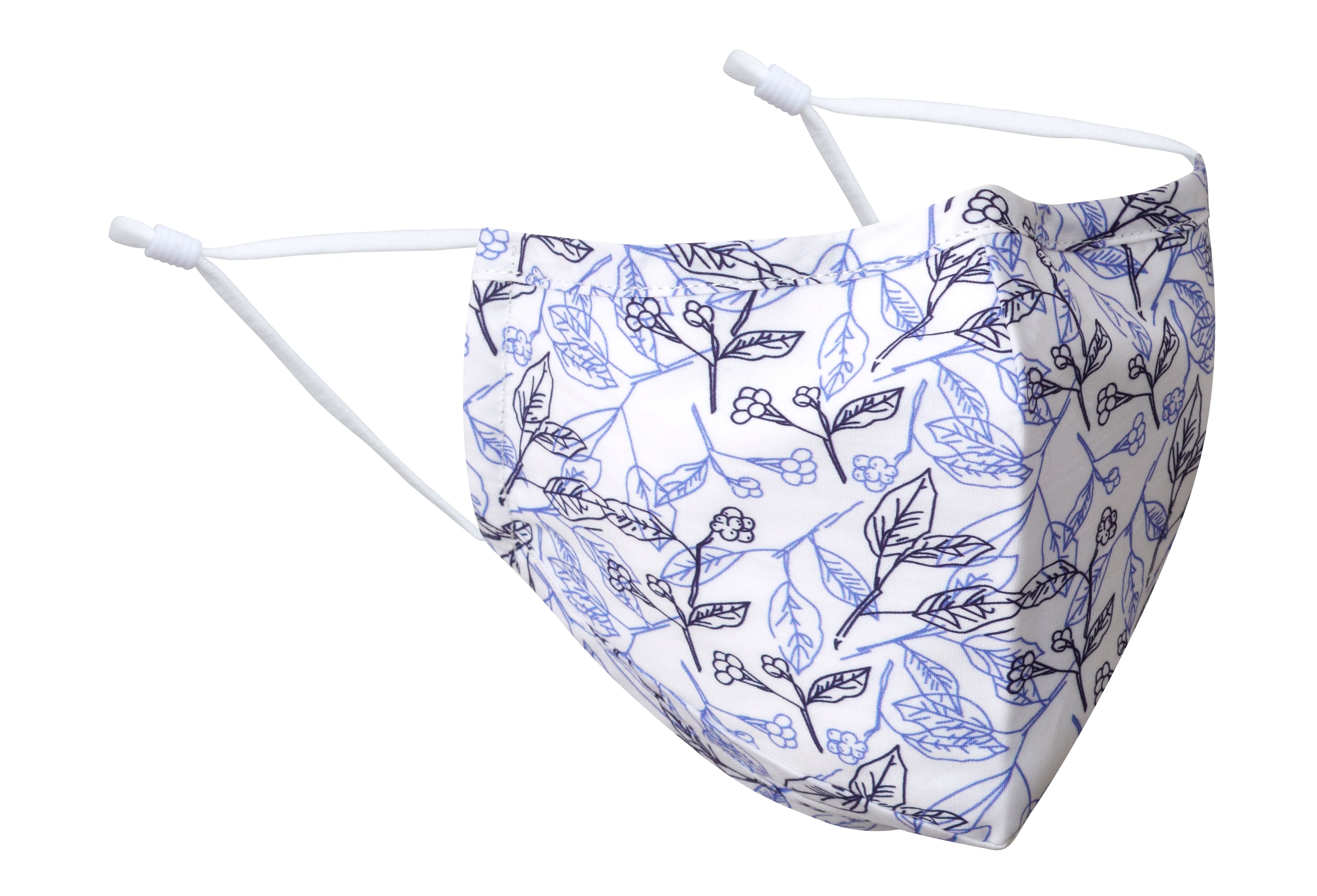 Bright white cotton creates a snowy palette for light blue and black sketches of leaves and berries on this appealing face mask.