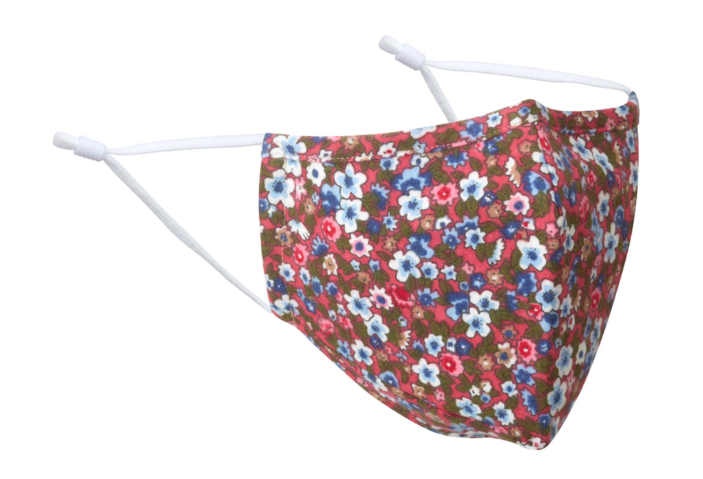 A background of dark pink cotton hosts clusters of blue, white and pink blossoms and sage green foliage on this charming face mask.