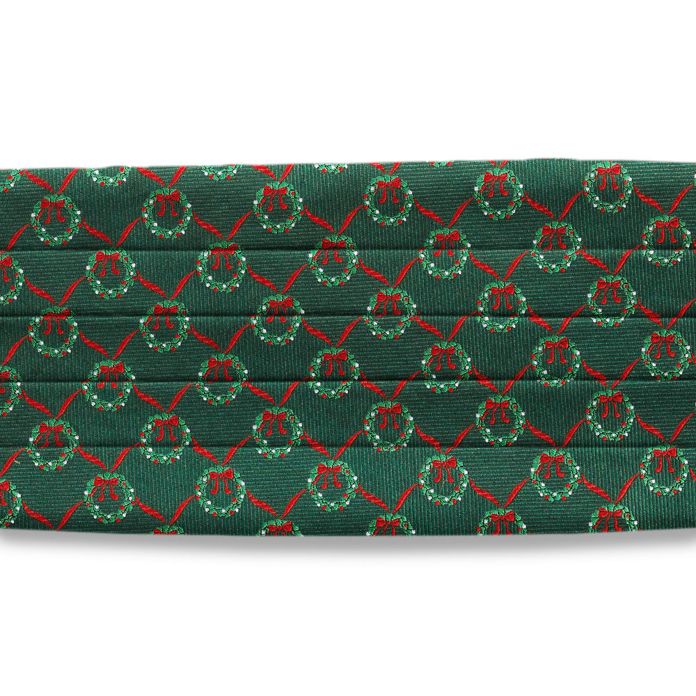 Lightly ribbed pine green woven silk squares, each bordered with ribbons of red, are highlighted by beautifully decorated holiday wreaths. A seasonal must-have.