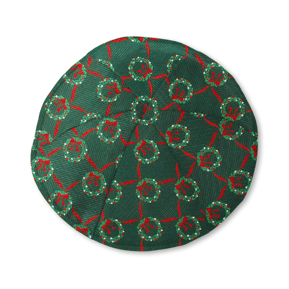 Lightly ribbed pine green woven silk squares, each bordered with ribbons of red, are highlighted by beautifully decorated holiday wreaths. A seasonal must-have.