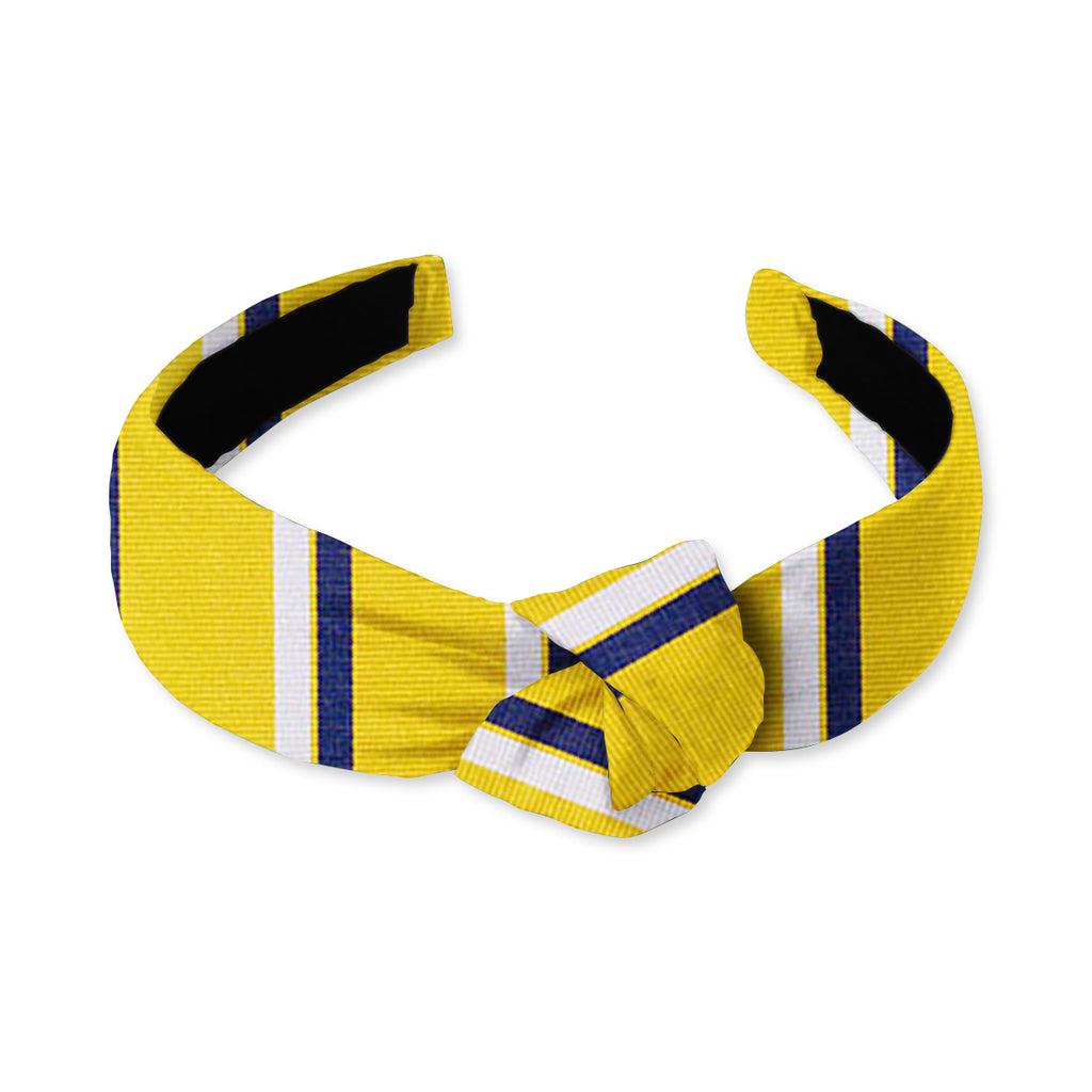 A classic combination of Yellow, navy blue and white, this handsome stripe in woven silk with a lightly ribbed texture will stand the test of time.
