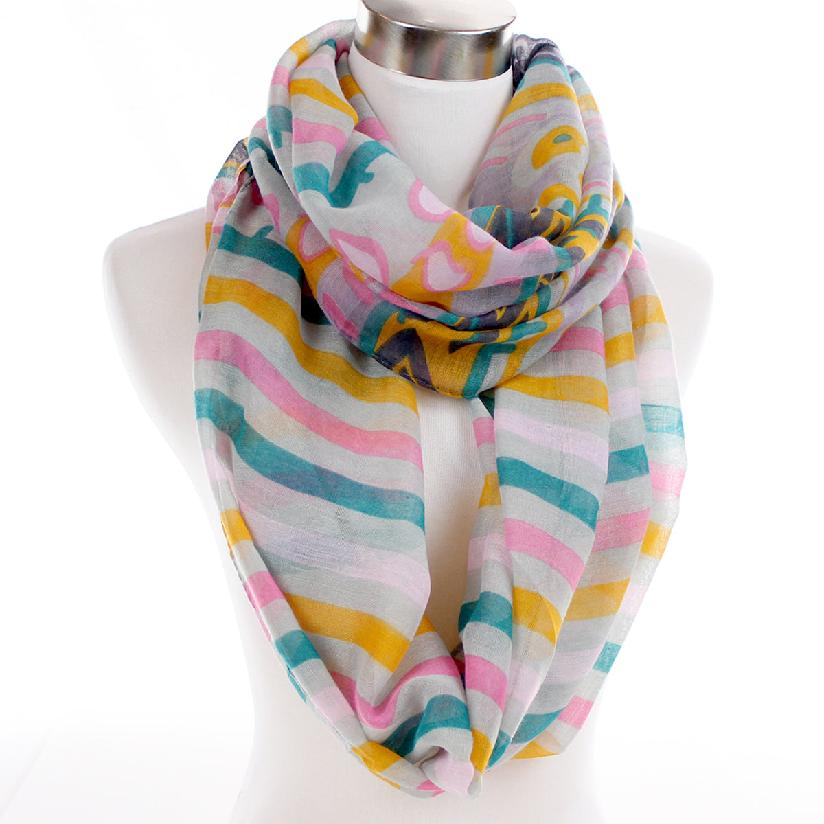 Repeating quartets of gold, white, blue, and pink stripes abut a border pattern of abstract shapes in similar hues - all woven in pale blue. A great warm-weather infinity scarf.