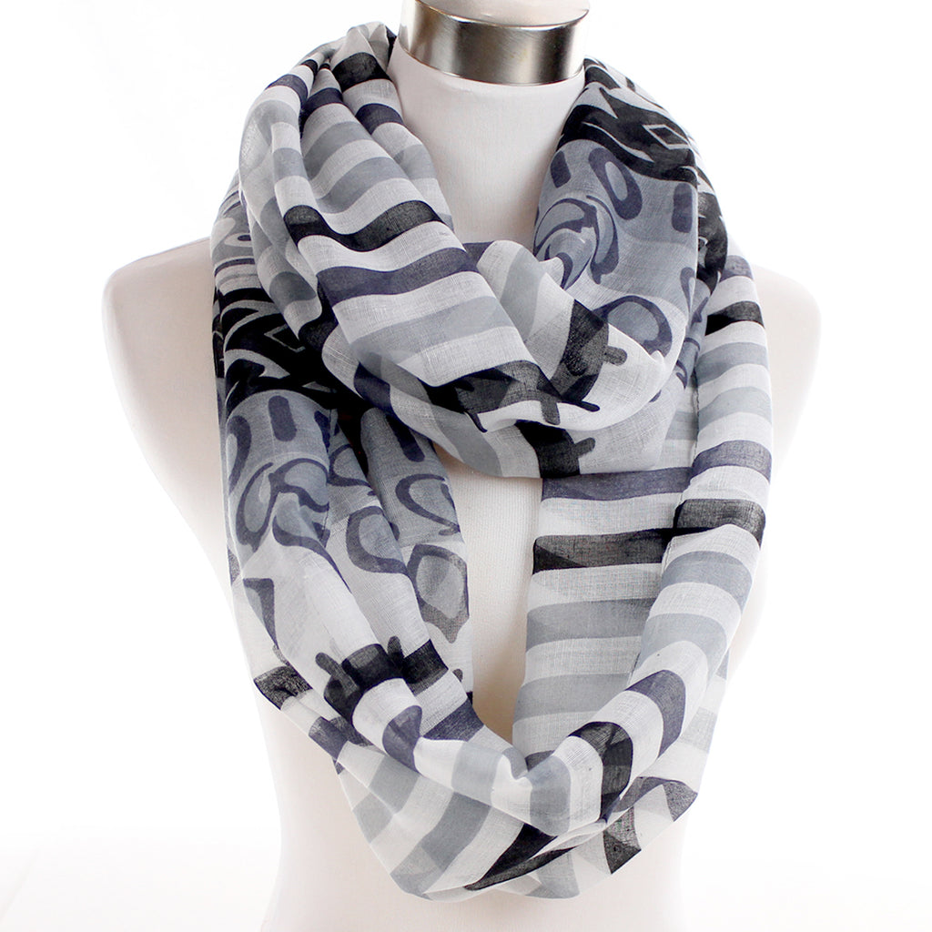Repeating quartets of stripes in shades of grey abut a border pattern of abstract shapes in similar hues - all woven in white. A great warm-weather infinity scarf.